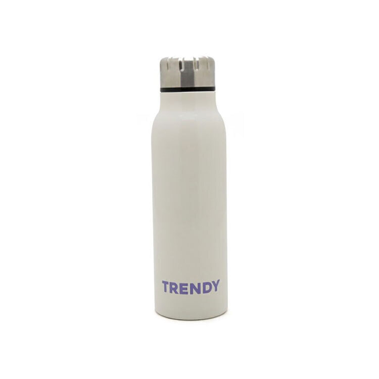 Botella termica Trendy , de capacidad 500 ml. Con capa Interna 100% de Acero Inoxidable AISI 304 y capa externa de acero inoxidable AISI 201 Tapa 100% de acero inoxidable AISI 201 con capa interna de polipropileno, burlete de silicona color transparente.